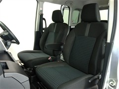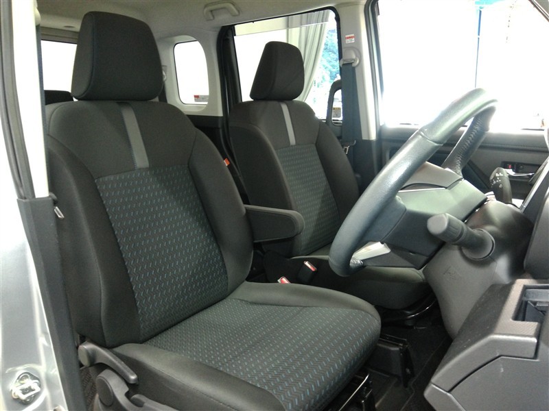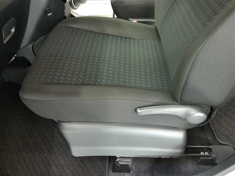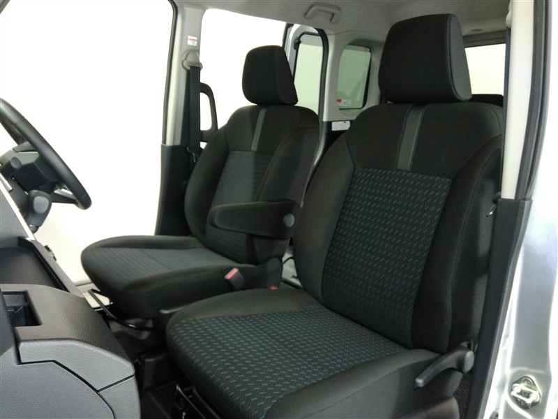 助手席側からの前席ビューです。ファブリックで包み込んだベーシックなシートです。通気性が良くて蒸れにくい上に、保温性も高いので冬場でも冷えを感じにくいです♪