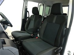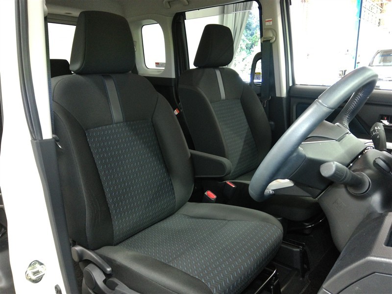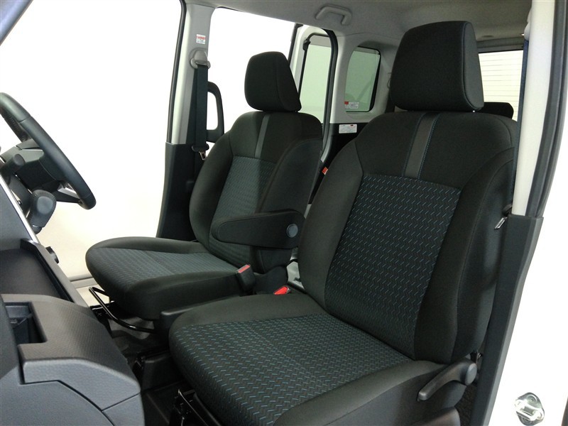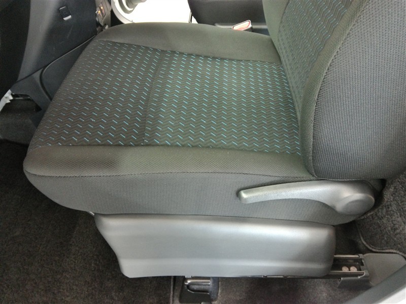 助手席側からの前席ビューです。ファブリックで包み込んだベーシックなシートです。通気性が良くて蒸れにくい上に、保温性も高いので冬場でも冷えを感じにくいです♪