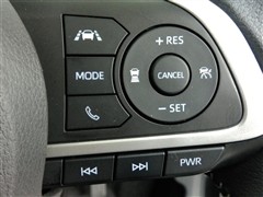 運転席側のステアリングスイッチです。クルーズコントロールの操作とオーディオの操作ができます。クルーズコントロールは高速道路走行時に燃費向上、運転者の疲労軽減に貢献します。