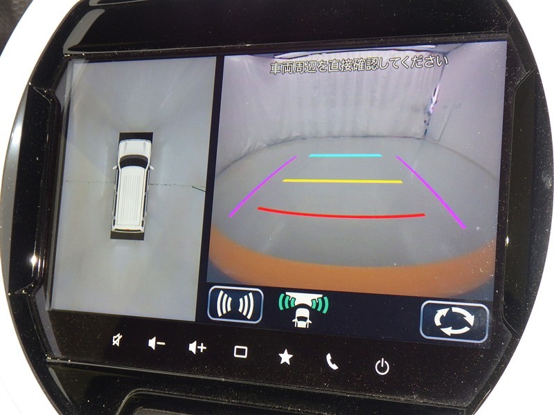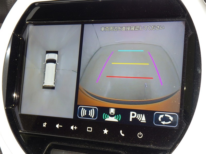 パノラミックビューモニターシステムが付いているので車の上から見た映像が確認できますよ。 一目で車両周辺の情報を確認できますが、直接安全をご確認下さい。