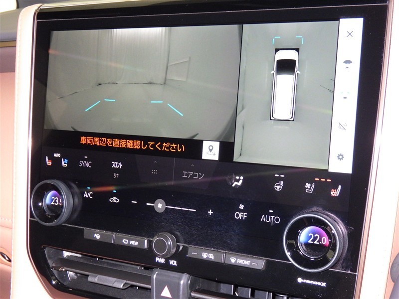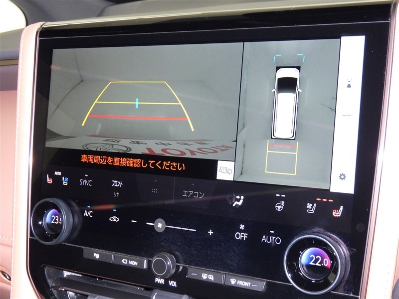 パノラミックビューモニターシステムが付いているので車の上から見た映像が確認できますよ。 一目で車両周辺の情報を確認できますが、直接安全をご確認下さい。