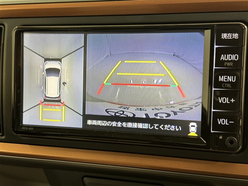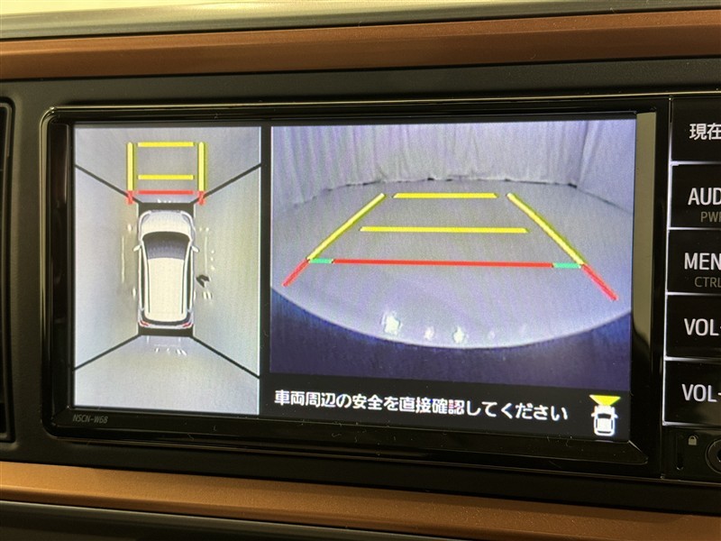 パノラミックビューモニターシステムが付いているので車の上から見た映像が確認できますよ。 一目で車両周辺の情報を確認できますが、直接安全をご確認下さい。