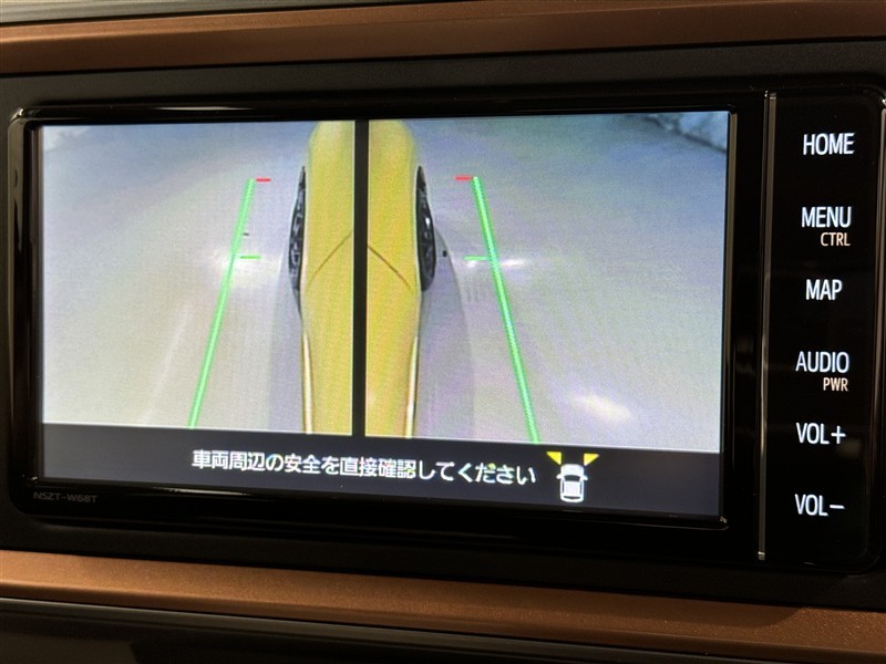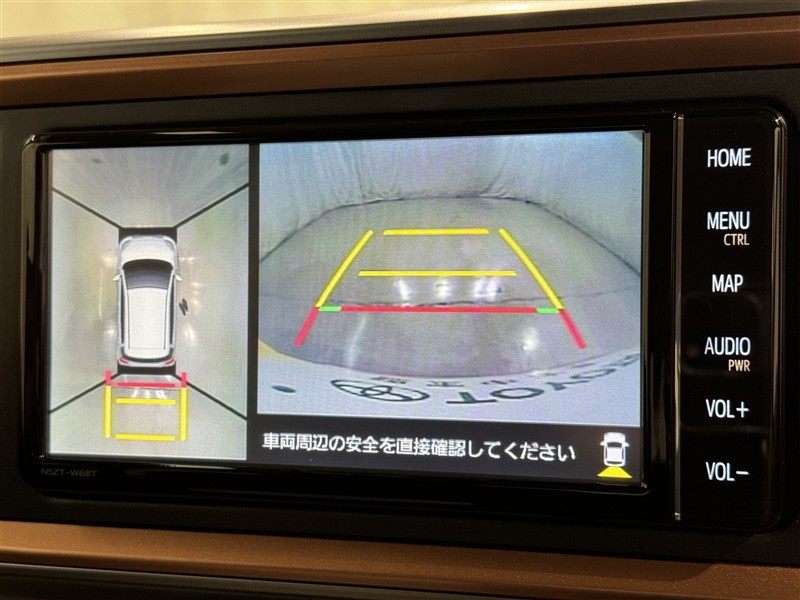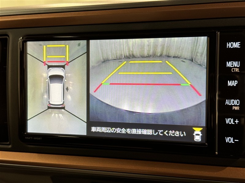 パノラミックビューモニターシステムが付いているので車の上から見た映像が確認できますよ。 一目で車両周辺の情報を確認できますが、直接安全をご確認下さい。