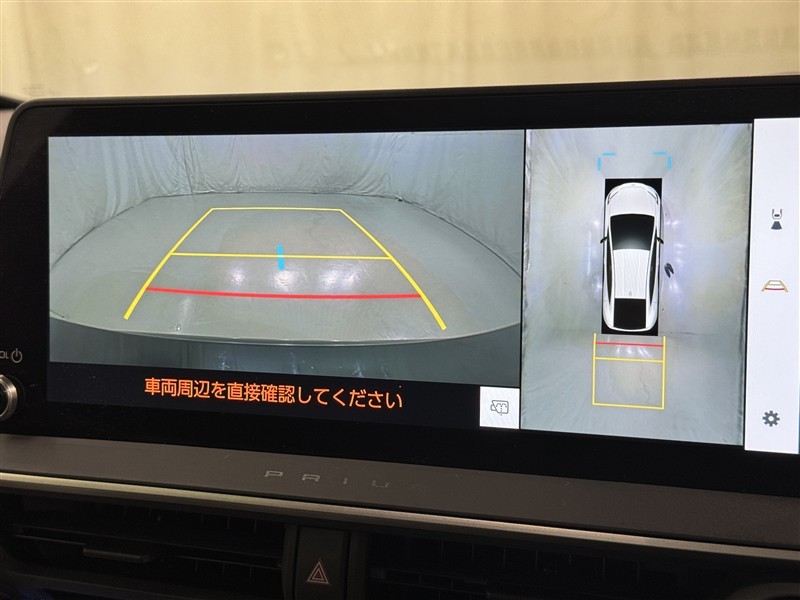 パノラミックビューモニターシステムが付いているので車の上から見た映像が確認できますよ。 一目で車両周辺の情報を確認できますが、直接安全をご確認下さい。