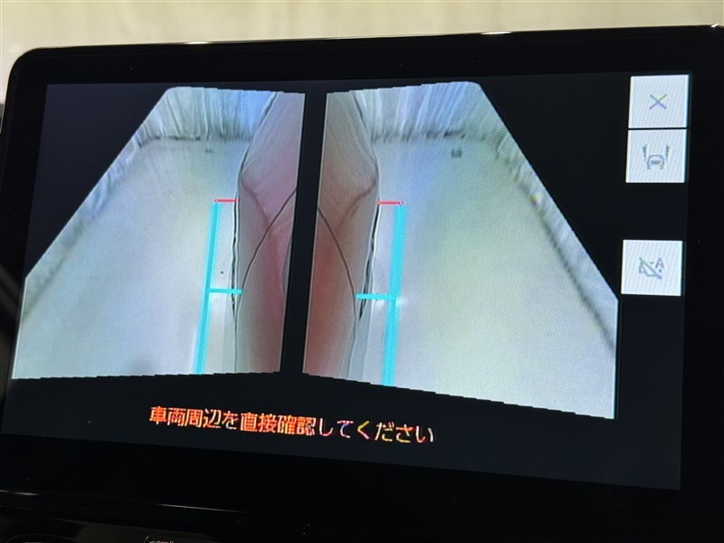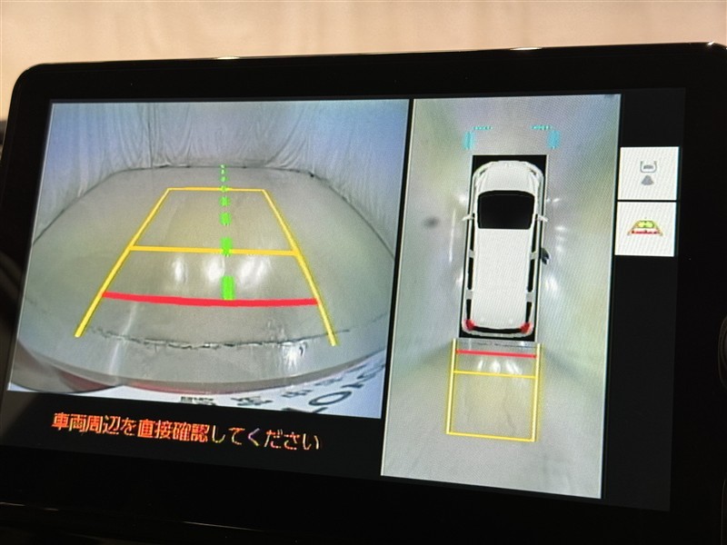 パノラミックビューモニターシステムが付いているので車の上から見た映像が確認できますよ。 一目で車両周辺の情報を確認できますが、直接安全をご確認下さい。