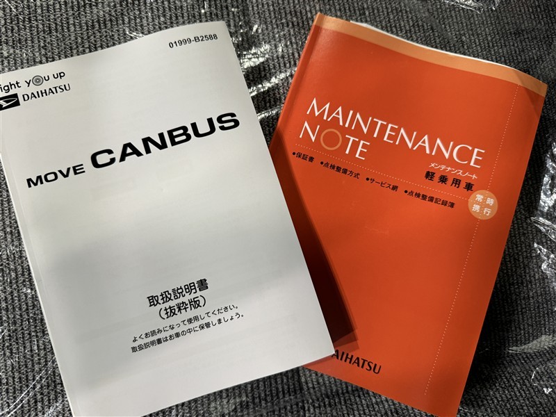 メンテナンスノート、取扱説明書です。 その車の整備記録が事細やかに記録されています。 車が生まれてから今までどのような道を歩んできたのか判るとても重要な物ですよ。