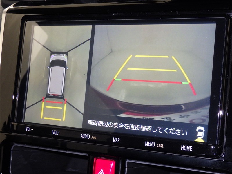 パノラミックビューモニターシステムが付いているので車の上から見た映像が確認できますよ。 一目で車両周辺の情報を確認できますが、直接安全をご確認下さい。