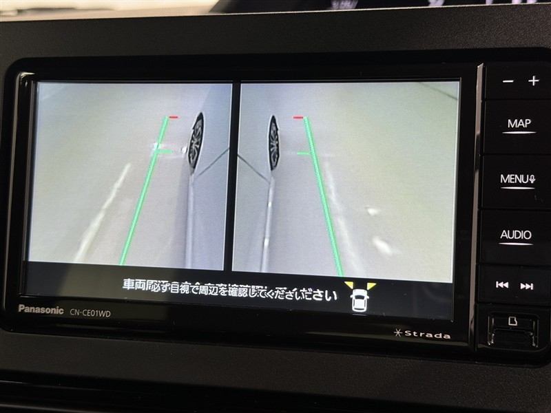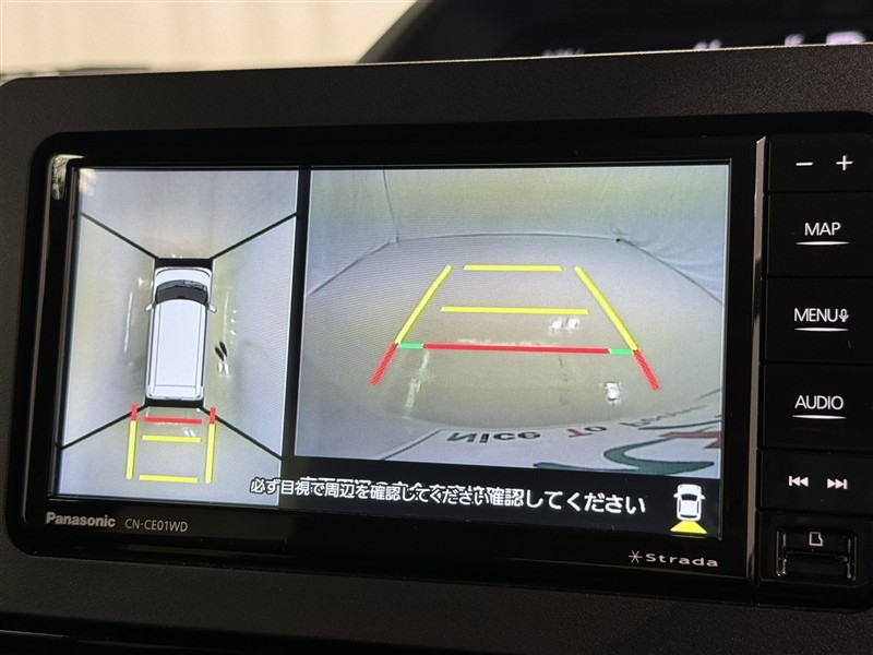 パノラミックビューモニターシステムが付いているので車の上から見た映像が確認できますよ。 一目で車両周辺の情報を確認できますが、直接安全をご確認下さい。