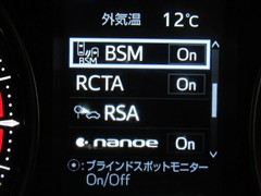 車線変更時などに、ドアミラーでは確認しにくい後側方エリア(ブラインドスポット)に存在する車両をレーダーで検知。警告サインをドアミラー等に表示することで、運転者に注意喚起する機能。