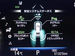 車線変更時などに、ドアミラーでは確認しにくい後側方エリア(ブラインドスポット)に存在する車両をレーダーで検知。警告サインをドアミラー等に表示することで、運転者に注意喚起する機能。
