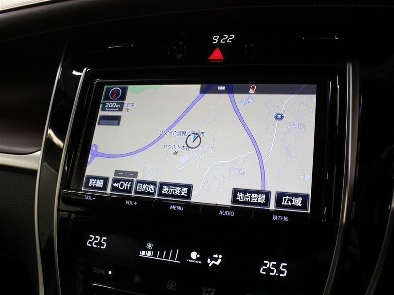 安全を考慮し、視線移動の少ない位置にセットされた純正9インチSDナビ!CD、DVDビデオ、フルセグTVに対応でUSB/HDMI端子も備えられています。