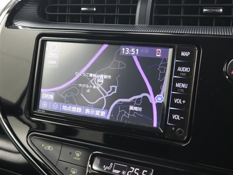 安全を考慮し、視線移動の少ない位置にセットされた純正SDナビが搭載されています。