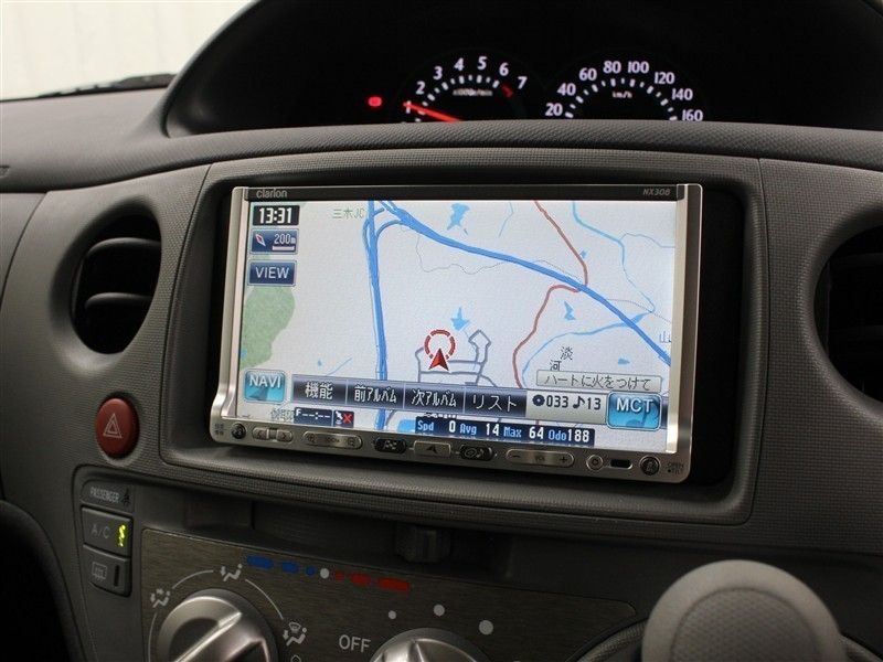 安全を考慮し、視線移動の少ない位置にセットされたクラリオンのメモリーナビ!CD、DVDビデオ、ワンセグTVに対応しています。