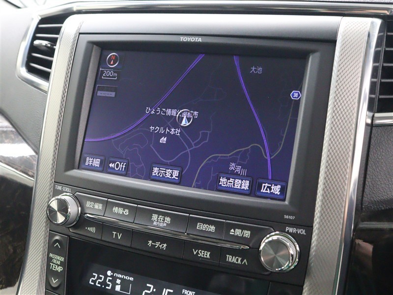 安全性を考慮し、視線移動の少ない位置にセットされたメーカーHDDナビ!CD、DVDビデオ、フルセグTVに対応でUSB端子も備えられています。
