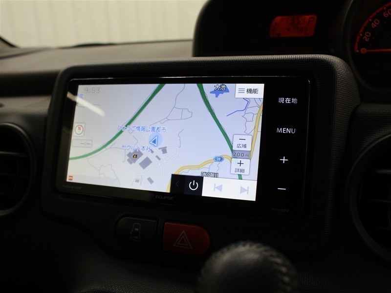 安全を考慮し、視線移動の少ない位置にセットされたイクリプスのSDナビ!CD、DVDビデオ、フルセグTVに対応しています。