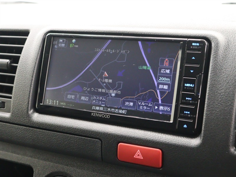 安全性を考慮し、視線移動の少ない位置にセットされたケンウッド製メモリーナビ!CD、ワンセグTVに対応しています。