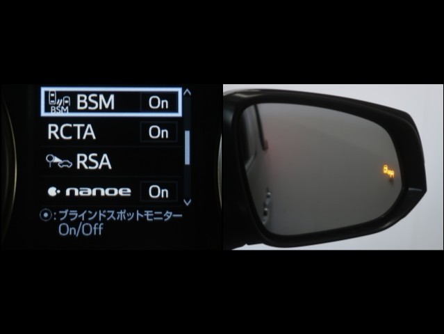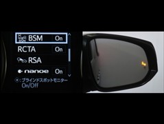 車線変更時などに、ドアミラーでは確認しにくい後側方エリア(ブラインドスポット)に存在する車両をレーダーで検知。警告サインをドアミラー等に表示することで、運転者に注意喚起する機能。