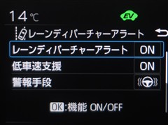 レーンディパーチャーアラートとは車線、又は走路からの逸脱の可能性を警告すると共に、車線、又は走路からの逸脱を避けるためのハンドル操作の一部を支援する機能です。詳細は販売店スタッフまでお尋ね下さい。