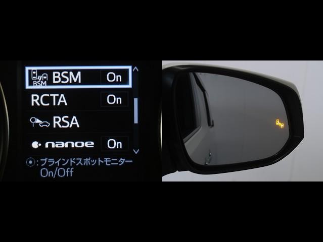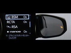 車線変更時などに、ドアミラーでは確認しにくい後側方エリア(ブラインドスポット)に存在する車両をレーダーで検知。警告サインをドアミラー等に表示することで、運転者に注意喚起する機能。