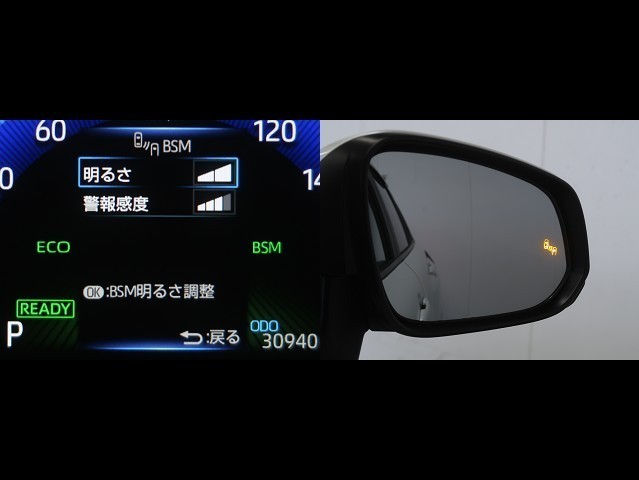 車線変更時などに、ドアミラーでは確認しにくい後側方エリア(ブラインドスポット)に存在する車両をレーダーで検知。警告サインをドアミラー等に表示することで、運転者に注意喚起する機能。
