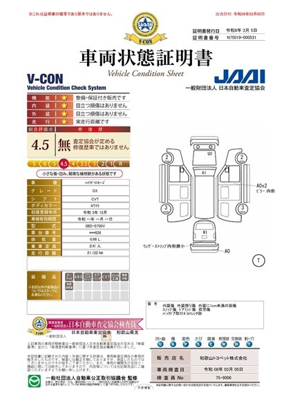 第三者機関「日本自動車査定協会」の車両状態証明書にて情報開示。一台ずつ内外装をチェック。安心のトヨペットU-Car!★査定協会評価点4.5点★