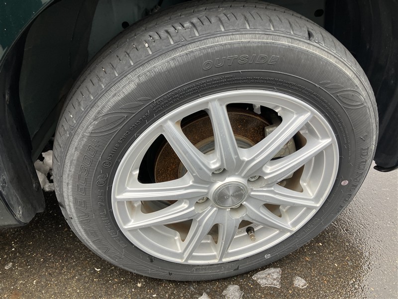 社外アルミ。タイヤサイズは165/65R14、現在は夏タイヤ装着で残り溝は約3ミリです