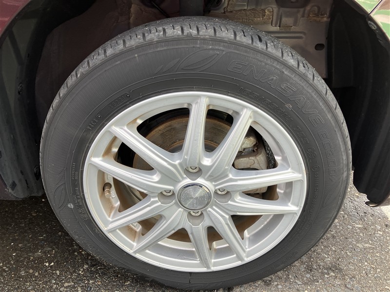 社外アルミ。タイヤサイズは165/65R14、現在は夏タイヤ装着で残り溝は約5ミリです