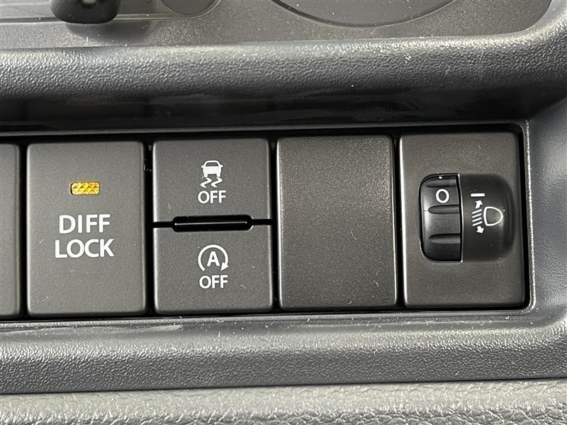 デフロックスイッチ、ESP OFFスイッチ、アイドリングストップシステムOFFスイッチ、光軸調整ダイヤル。