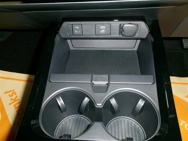 ドリンクホルダーとトレイスペースです。USB入力端子や充電端子も付いております。