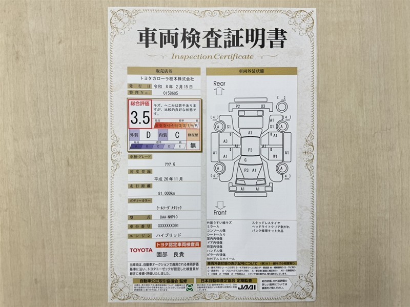 トヨタ自動車が認定した検査員が、厳正に検査した車両検査証明書を発行しています。キズの程度や場所を展開図で分かりやすく表示しているのでおクルマの状態がすぐ分かります。