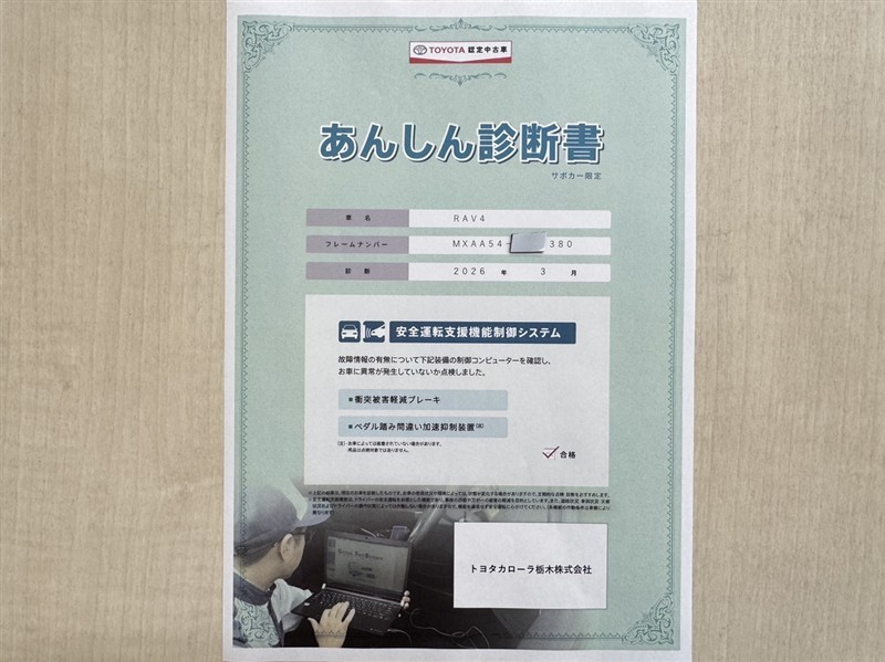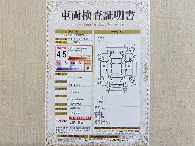 トヨタ自動車が認定した検査員が、厳正に検査した車両検査証明書を発行しています。キズの程度や場所を展開図で分かりやすく表示しているのでおクルマの状態がすぐ分かります。
