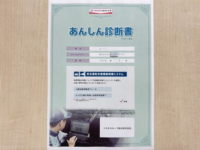 トヨタ自動車が認定した検査員が、厳正に検査した車両検査証明書を発行しています。キズの程度や場所を展開図で分かりやすく表示しているのでおクルマの状態がすぐ分かります。
