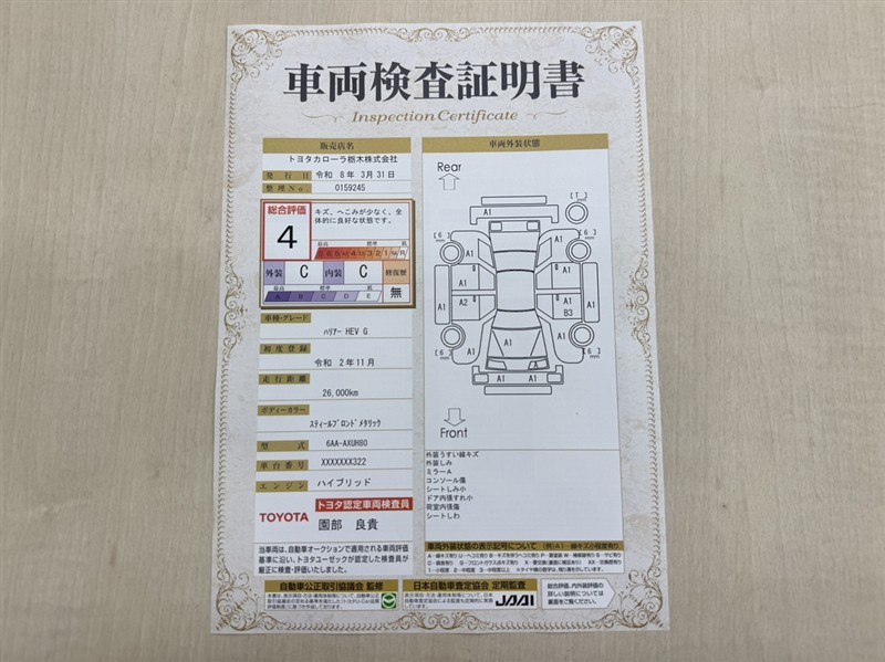 トヨタ自動車が認定した検査員が、厳正に検査した車両検査証明書を発行しています。キズの程度や場所を展開図で分かりやすく表示しているのでおクルマの状態がすぐ分かります。