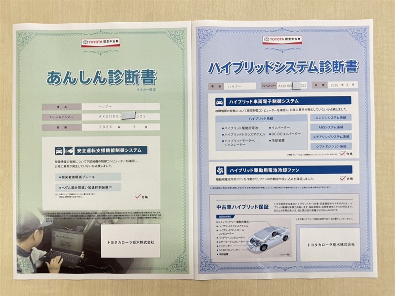 「サポカーあんしん診断」「ハイブリットシステム診断」実施済み。安心安全にお乗り頂けるようトヨタ専用診断機器で綿密にシステムを点検しています。