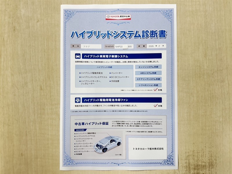 「ハイブリッドシステム診断」実施済み。トヨタ専用診断機器でハイブリッドシステムを綿密に点検しています。