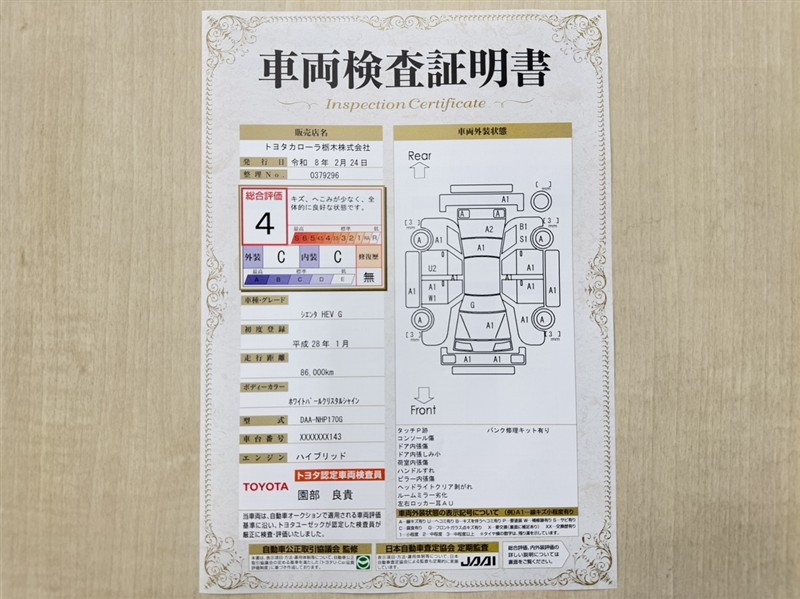 トヨタ自動車が認定した検査員が、厳正に検査した車両検査証明書を発行しています。キズの程度や場所を展開図で分かりやすく表示しているのでおクルマの状態がすぐ分かります。