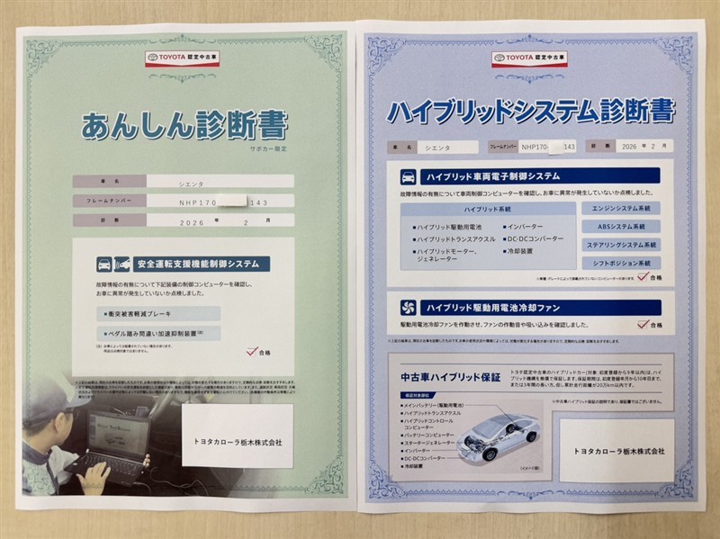 「サポカーあんしん診断」「ハイブリッドシステム診断」実施済み。トヨタ専用診断機器で安心安全にお乗り頂けるよう、綿密に点検しています。