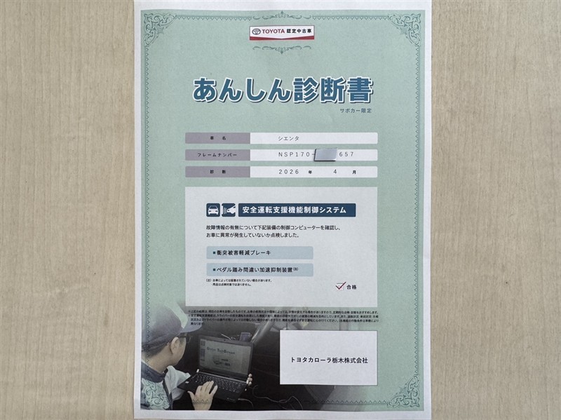 「サポカーあんしん診断」「ハイブリットシステム診断」実施済み。安心安全にお乗り頂けるようトヨタ専用診断機器で綿密にシステムを点検しています。