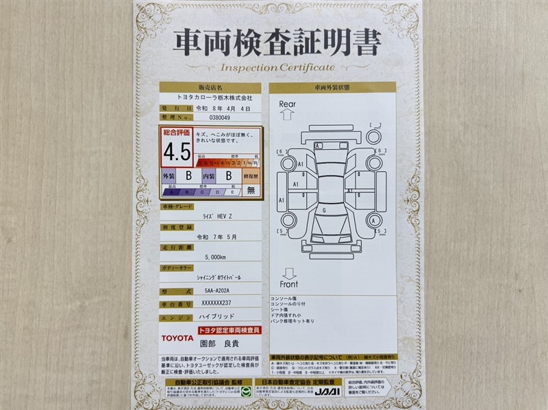 トヨタ自動車が認定した検査員が、厳正に検査した車両検査証明書を発行しています。キズの程度や場所を展開図で分かりやすく表示しているのでおクルマの状態がすぐ分かります。