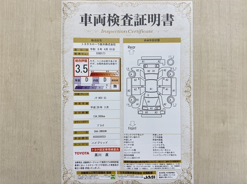 トヨタ自動車が認定した検査員が、厳正に検査した車両検査証明書を発行しています。キズの程度や場所を展開図で分かりやすく表示しているのでおクルマの状態がすぐ分かります。