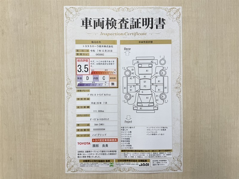 トヨタ自動車が認定した検査員が、厳正に検査した車両検査証明書を発行しています。キズの程度や場所を展開図で分かりやすく表示しているのでおクルマの状態がすぐ分かります。