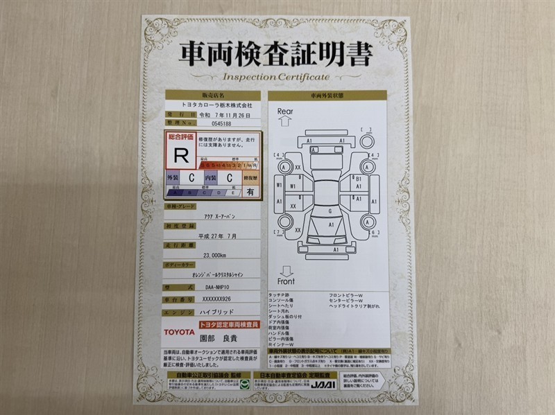 トヨタ自動車が認定した検査員が、厳正に検査した車両検査証明書を発行しています。キズの程度や場所を展開図で分かりやすく表示しているのでおクルマの状態がすぐ分かります。