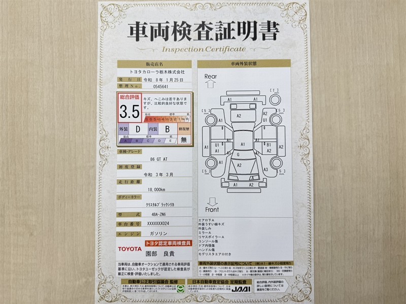 トヨタ自動車が認定した検査員が、厳正に検査した車両検査証明書を発行しています。キズの程度や場所を展開図で分かりやすく表示しているのでおクルマの状態がすぐ分かります。