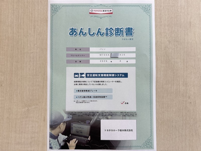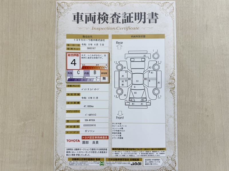 トヨタ自動車が認定した検査員が、厳正に検査した車両検査証明書を発行しています。キズの程度や場所を展開図で分かりやすく表示しているのでおクルマの状態がすぐ分かります。