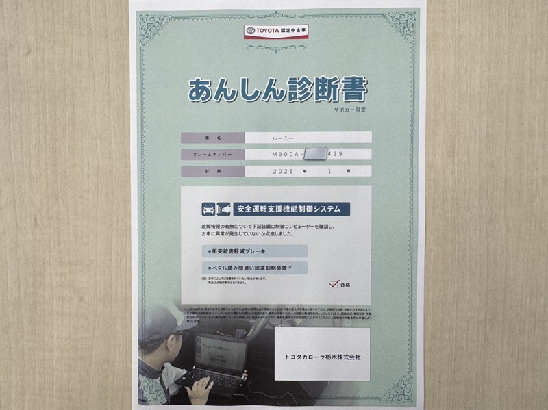 トヨタ自動車が認定した検査員が、厳正に検査した車両検査証明書を発行しています。キズの程度や場所を展開図で分かりやすく表示しているのでおクルマの状態がすぐ分かります。