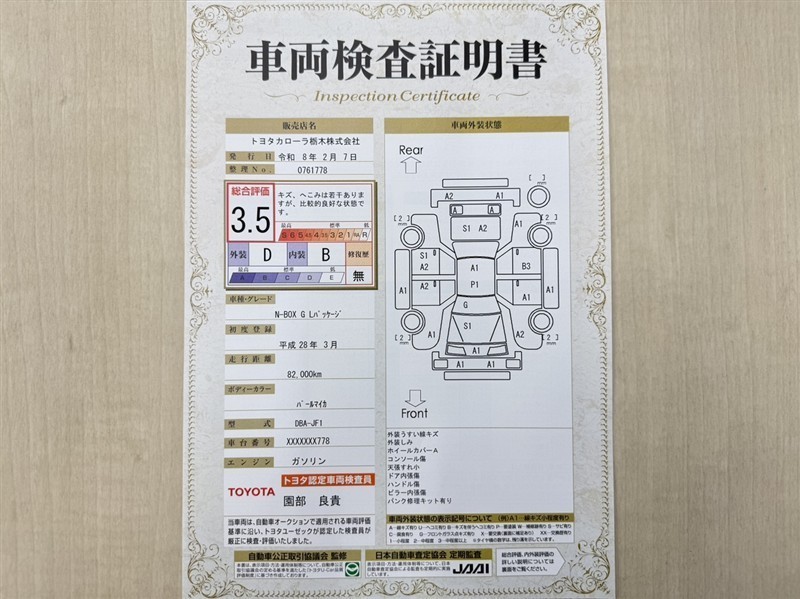 トヨタ自動車が認定した検査員が、厳正に検査した車両検査証明書を発行しています。キズの程度や場所を展開図で分かりやすく表示しているのでおクルマの状態がすぐ分かります。
