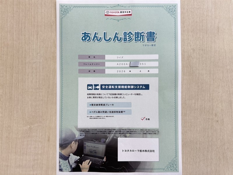 トヨタ自動車が認定した検査員が、厳正に検査した車両検査証明書を発行しています。キズの程度や場所を展開図で分かりやすく表示しているのでおクルマの状態がすぐ分かります。