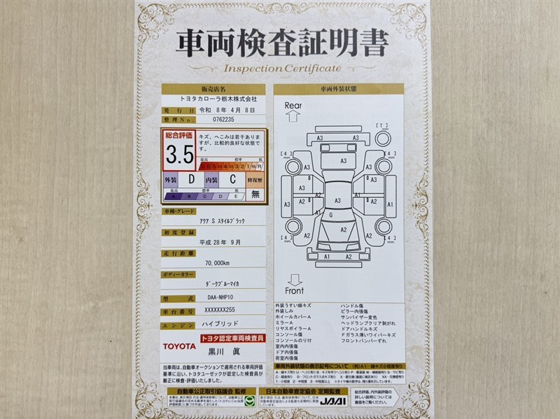 トヨタ自動車が認定した検査員が、厳正に検査した車両検査証明書を発行しています。キズの程度や場所を展開図で分かりやすく表示しているのでおクルマの状態がすぐ分かります。