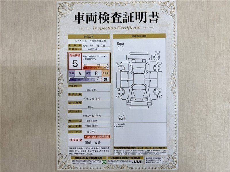 トヨタ自動車が認定した検査員が、厳正に検査した車両検査証明書を発行しています。キズの程度や場所を展開図で分かりやすく表示しているのでおクルマの状態がすぐ分かります。