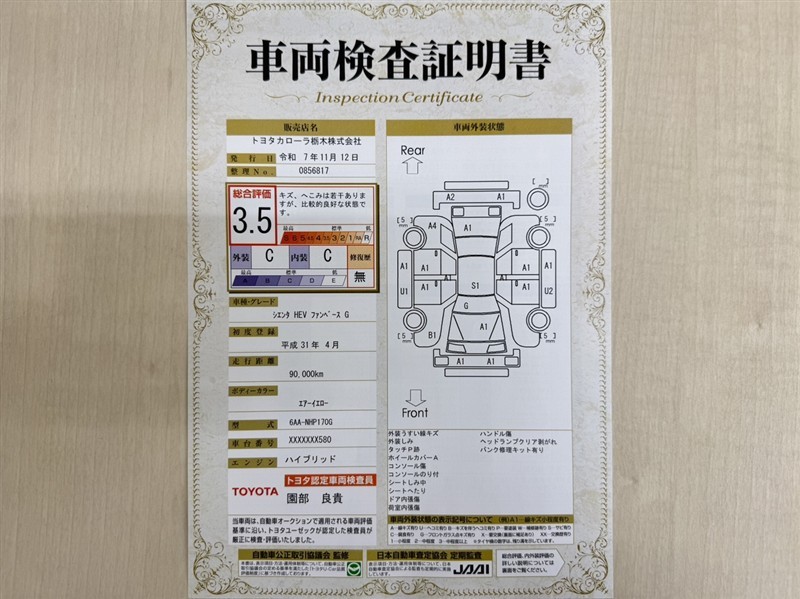 トヨタ自動車が認定した検査員が、厳正に検査した車両検査証明書を発行しています。キズの程度や場所を展開図で分かりやすく表示しているのでおクルマの状態がすぐ分かります。